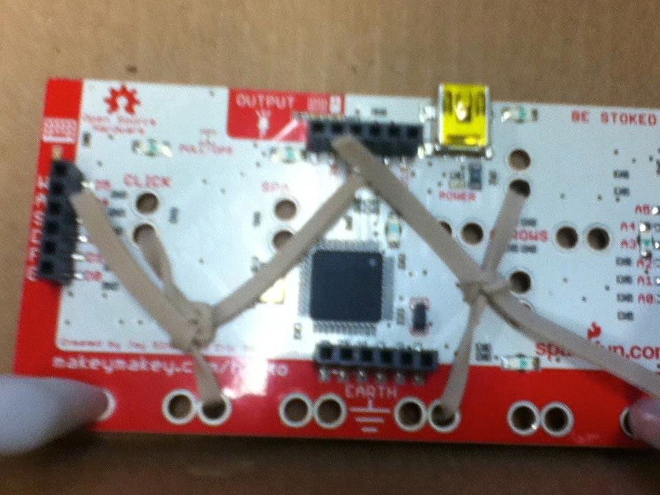 Step Two: Use rubber bands to attach the MaKey MaKey into the box. This is one area especially where improvements could be made. Here is what the group came up with. Lay the MaKey MaKey flat in the box (if holding the box open and looking at it head on, the group used right hand corner close to the front of the box). Carefully mark the inside of the four holes shown above (the right hole of the second ground from the left, the right hole of the ground third from the right, the bottom hole of the top arrow trigger, and the bottom hole of the click trigger). Once these are marked, take the MaKey MaKey out of the box and use a box cutter, scissors, or another sharp object to punch small holes through the bottom of the box in the marked spots.